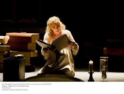 Хаген застреливает Гунтера из пистолета и хочет снять браслет с руки Зигфрида, но, угрожая пистолетом (а что еще остановит этого подонка?), дорогу к трупу ему преграждает Брюнхильда… Сцена медленно пустеет, и Брюнхильда остаётся одна с телом Зигфрида. Прижимаясь к нему щекой, она произносит слова о величии лучшего из лучших. Сзади появляются фолианты, сложенные на паллетах, между ними кресло, стоящее спинкой к залу. В нем - дряхлый старик, держащий обломки копья. Это Вотан. Словно убаюкивая, Брюнхильда прощается с умирающим отцом… Появляются валькирии, и Брюнхильда посылает их со страшной вестью в Валгаллу. Положив на один из фолиантов браслет власти, она поджигает горы талмудов. Медленно разгорается пламя, охватывая все новые и новые книги. Пылающие паллеты удаляются в глубь сцены, а под лейтмотив Логе гигантской проекцией пламени вспыхивает огромный задник сцены. Брюнхильда хватается за живот и быстро удаляется со сцены. Такого пожара в оркестре я не слышал никогда: тут и басовый перехлест, и валторновое буйство, группы инструментов словно сшибаются друг с другом, как падающие перекрытия, охваченные огнем! Описать этот огенно-звуковой ураган невозможно. Это нужно слышать.